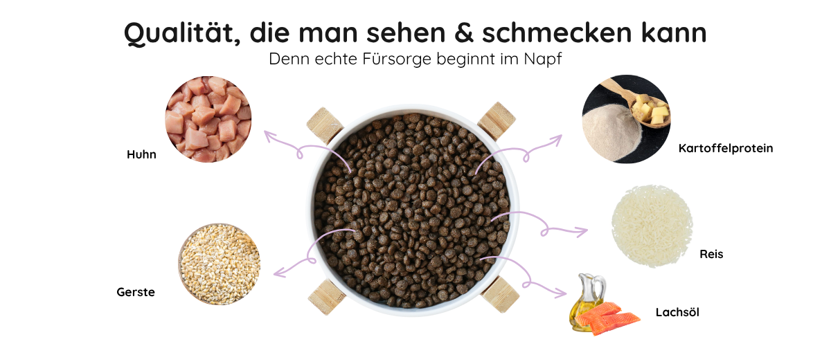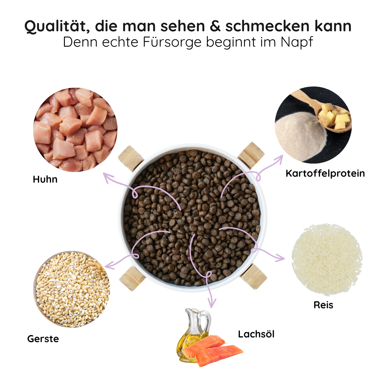 • Mit Reis, Geflügelprotein, Kartoffelprotein und Mineralstoffen