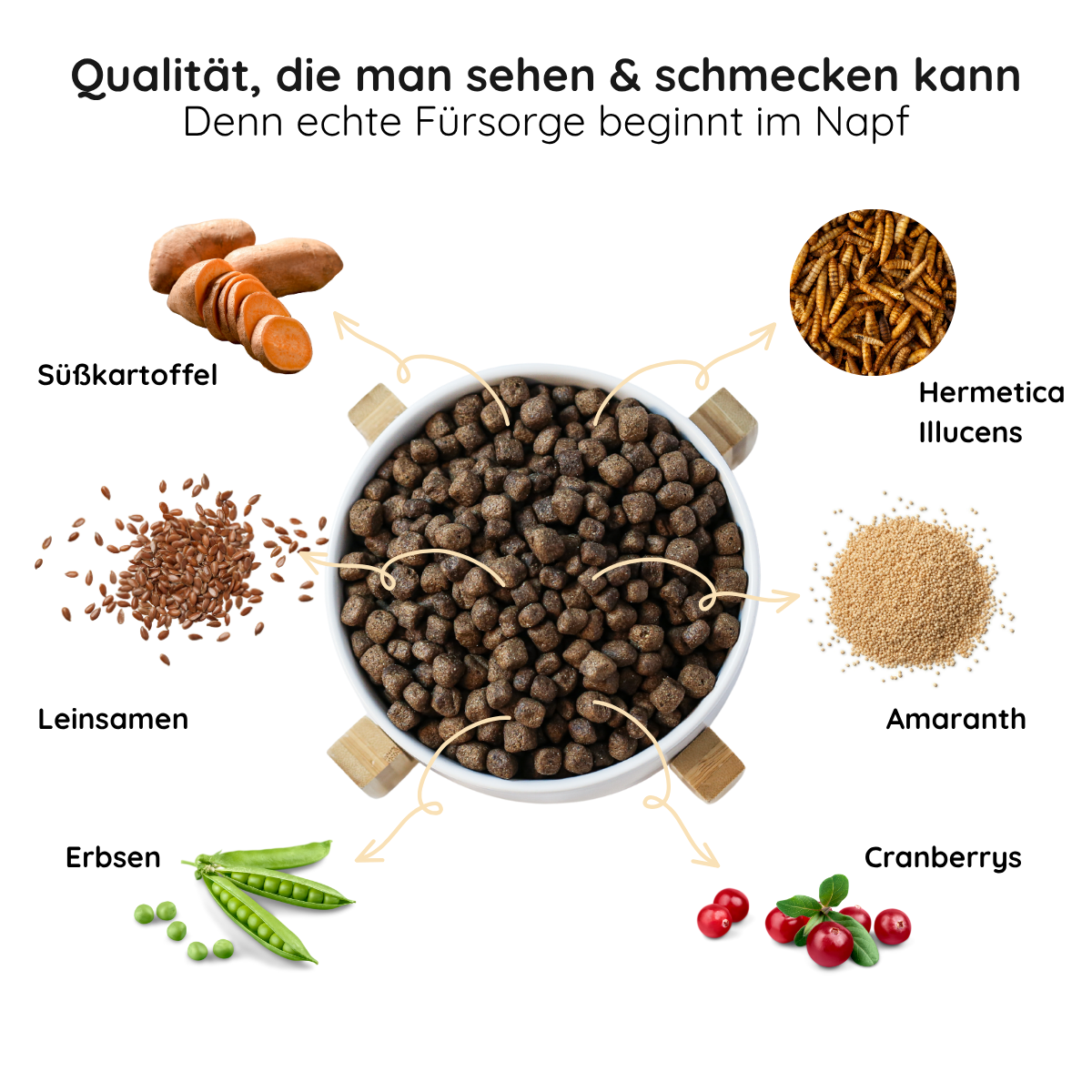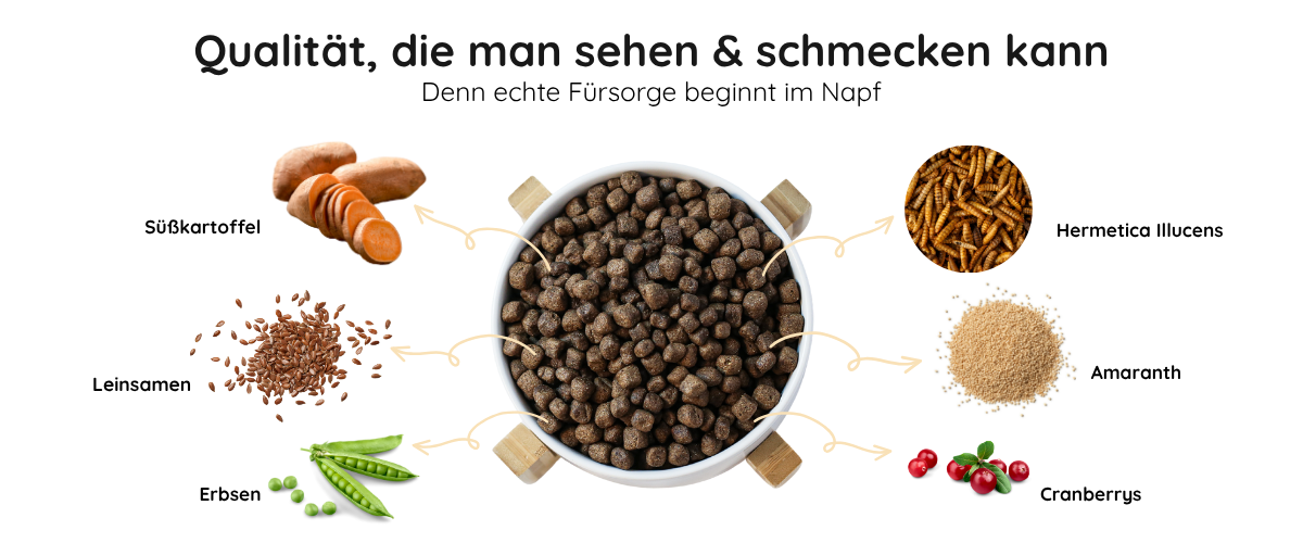 Zusammensetzung: Insektenprotein (Hermetia Illucens) (30%), Süßkartoffel (27%), Amaranth (12,5%), Erbsen (10%), Sonnenblumenöl (5%), Leinsaat, Bierhefe, Rübenmark Monokalziumphosphat, Apfel, Calciumcarbonat, Pastinake, Cranberries, Karotten, Meeresalgen, Chicoree (Quelle für Inulin), Natriumchlorid, Yucca Schidigera.