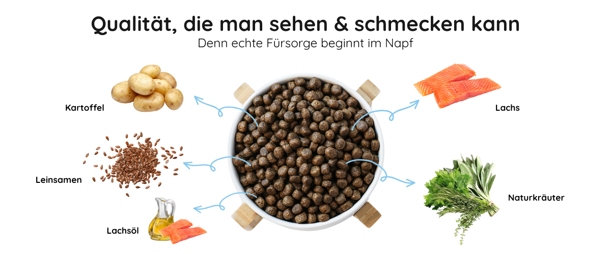 Zusammensetzung: Kartoffel (34%), Lachs getrocknet und gemahlen (25%), Kartoffelstärke, Kartoffelprotein, Hefe, Leinsaat, Rübentrockenschnitzel, Monokalziumphosphat, Natiumchlorid, Kaliumchlorid, Lachsöl, Inulin (FOS), tierisches Eiweiß-Hydrolysat, Yucca Schidigera Extrakt, Kräutermischung (Petersilie, Rosmarin, Brennessel, Kamille, Salbei, Thymian, Koriander, Löwenzahn, Süßholz).